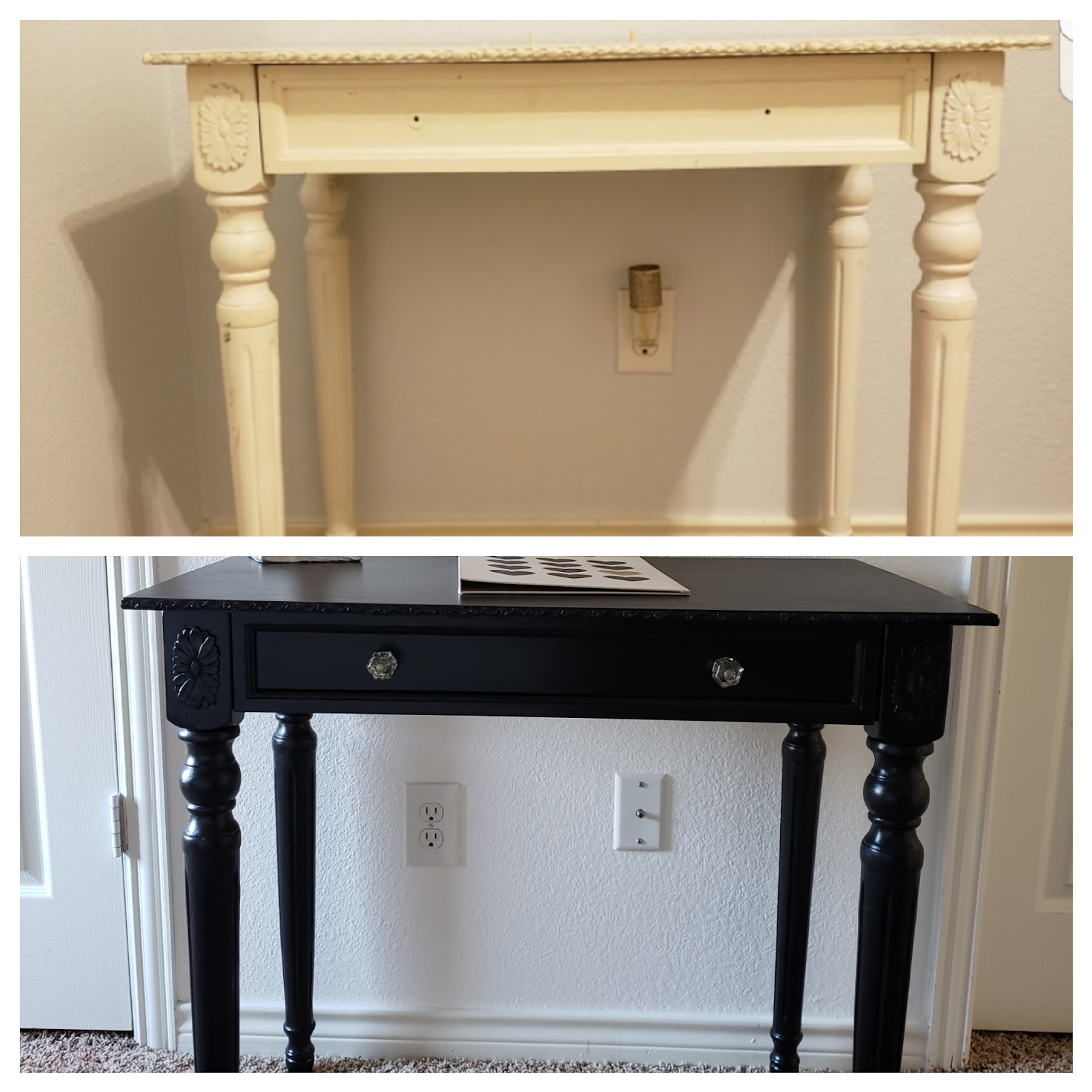 Now to fix the bench! It had all of these cracks and he said he could fix it so he did. I painted it black and mom and dad recovered it with white fur.